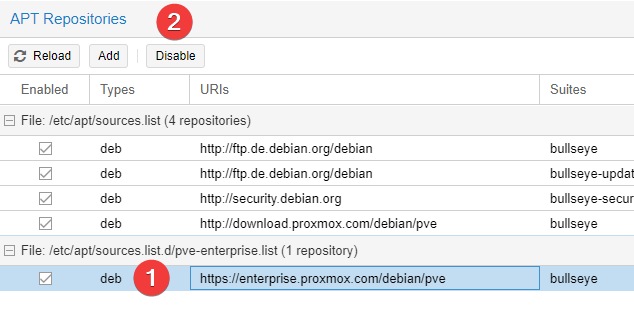 Now select the enterprise repository (last line) by clicking on it and clicking Disable.