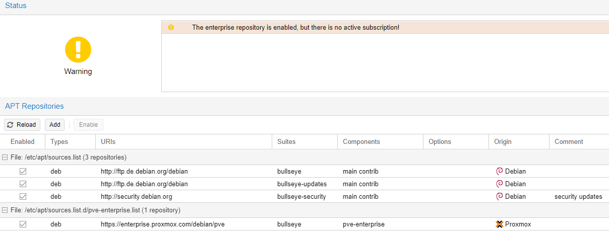Click on Add and click OK on the "No valid subscription" warning.