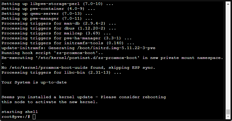 Once the process is finished, you should see "Your system is up to date". If the update/upgrade included a kernel update it will say "Seems you installed a kernel update — Please consider rebooting this node to activate the new kernel." We should do this in a second.