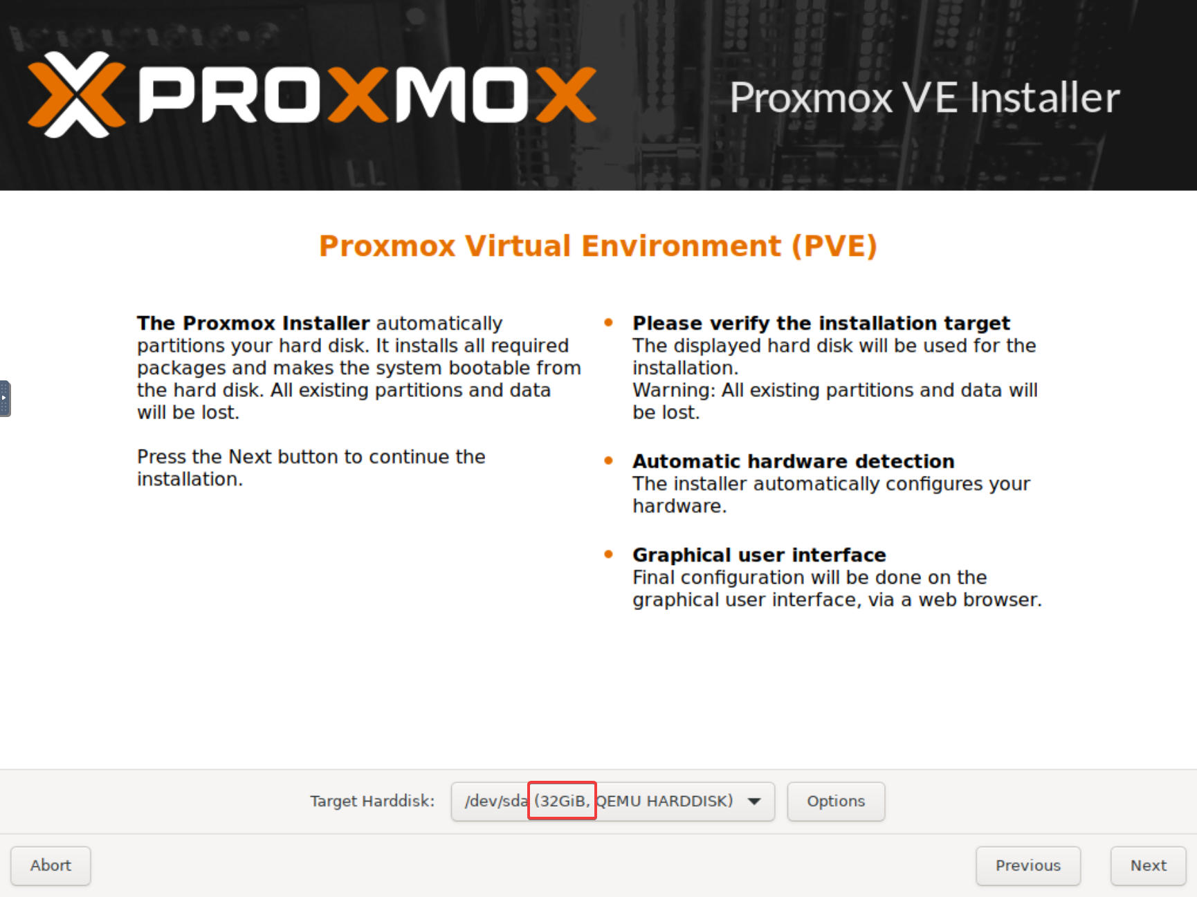 On the next screen, Proxmox Virtual Environment (PVE), make sure that the correct target disk for the Proxmox OS is selected. It will be the 32 GiB drive you configured as the primary vDisk.