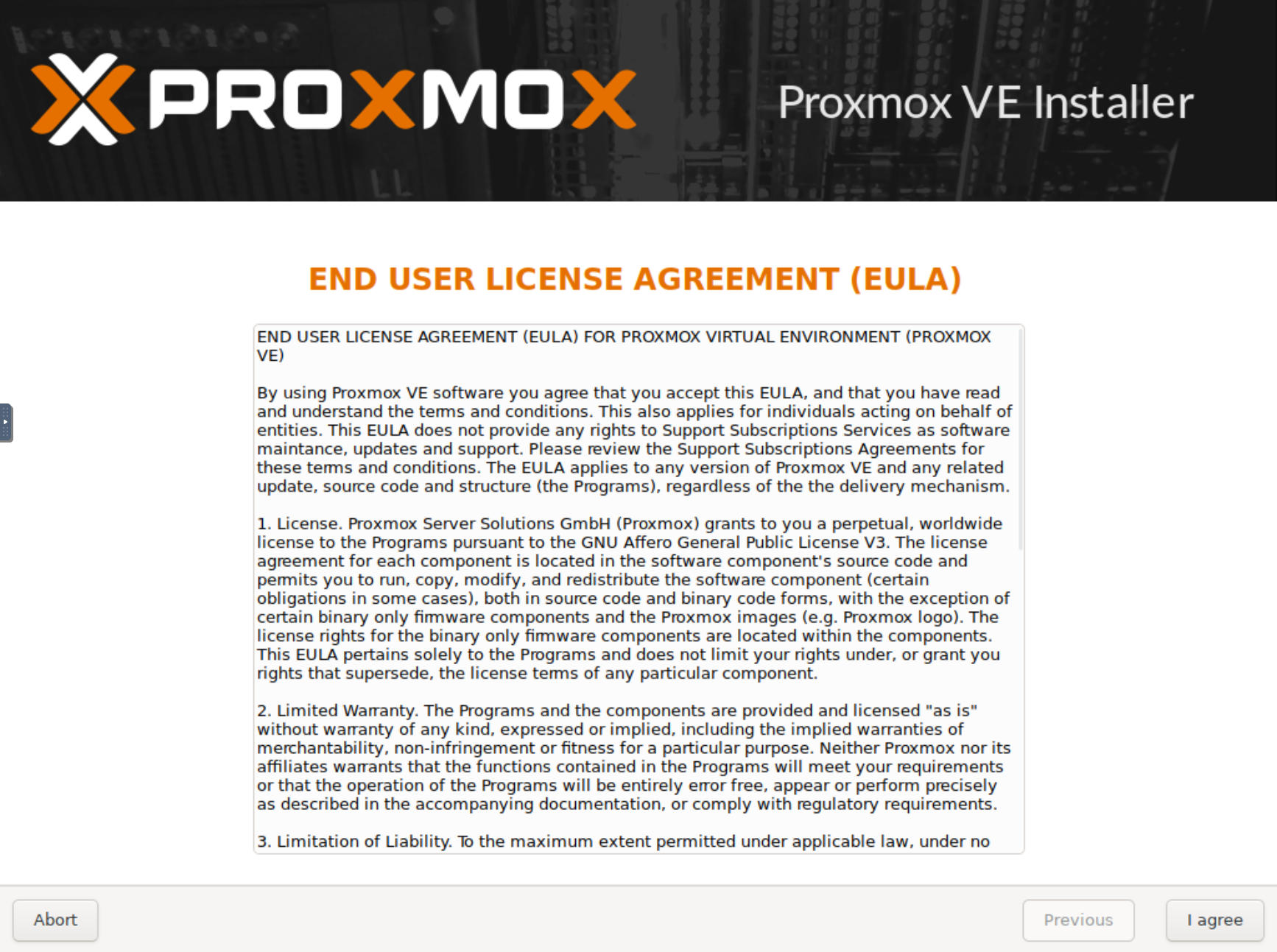 Wait for the Proxmox installer to boot until you are presented with the End User Licence Agreement (EULA).