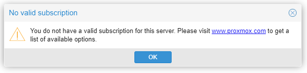 You will get a warning about not having a valid subscription. Don't worry. Proxmox is open source and free. However, they would like you to purchase a subscription. With a subscription, you will get access to the paid repository for updates. Further down we will change to the free repository. Expect more reminders like that. Unless you want to go into production with a Proxmox server and choose to purchase a subscription, stick to the free edition.